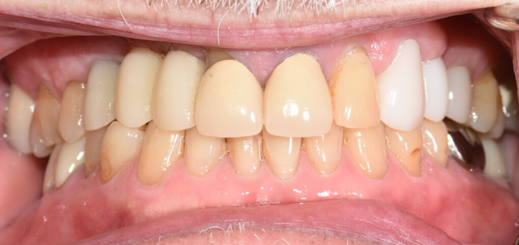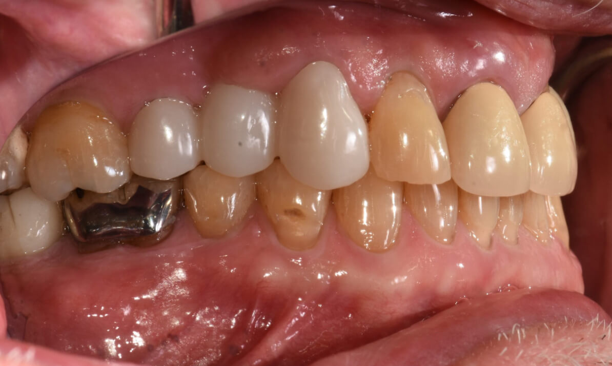Next, the temporaries on teeth #8 and #9 were removed. The crowns for these teeth were seated and evaluated, and slight adjustments to interproximal contacts and occlusion were made. Once the ideal fit and occlusion were confirmed, the crowns were cemented using RelyX Universal Cement.