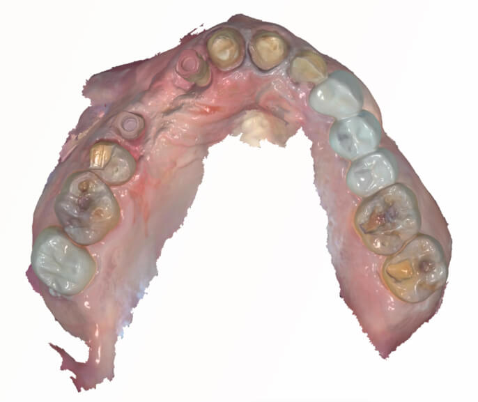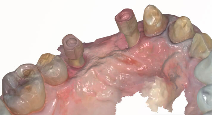 Figure 3a, 3b, 3c: Intraoral scans of the maxillary arch. Note the seated scan bodies at sites #5 and #7, and the prepared teeth (#4, #8, #9, and #10). Compare this scan to the intraoral photo in Figure 2 above.