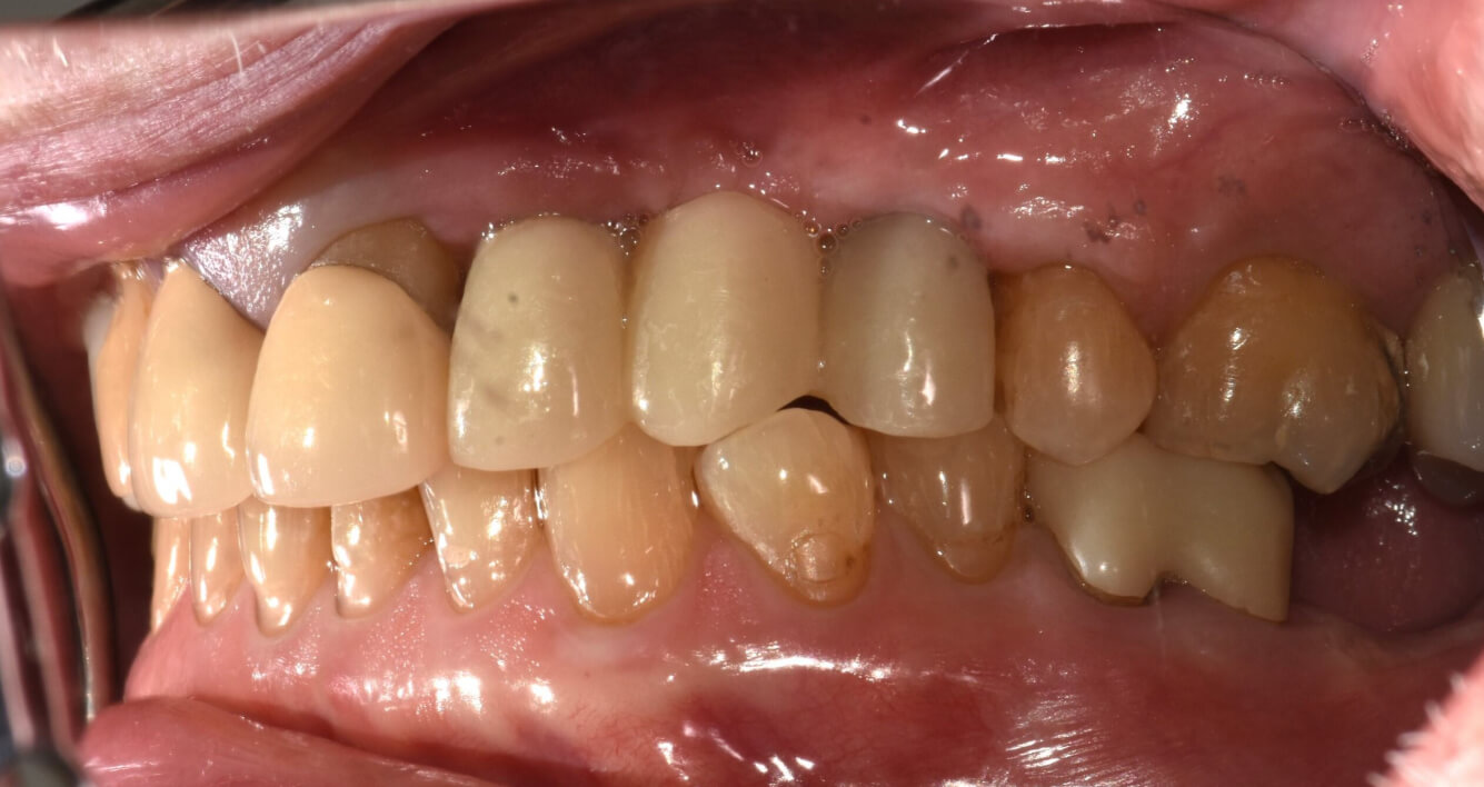 The patient achieved a highly satisfactory functional result with restorations in Vita B1 shade. The integration of veneers, crowns, and the implant-supported bridge created a cohesive, restored smile. The patient was educated on the proper care and maintenance of his restorations, including the significance of an occlusal guard to ensure the longevity of this treatment.